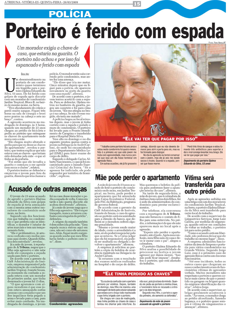 Porteiro de um condominio toma espadada de morador do predio porque não achou a chave. Até qui esta notícia não deveria estar no blog, mas… ele usou uma espada acertou o braço e a cabeça do porteiro!!!
