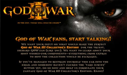 A Sony está perguntando quais os extras deve ter a Edição de Colecionador de God of War III. Existe até a possibilidade do segundo jogo estar nos extras. Veja a lista: