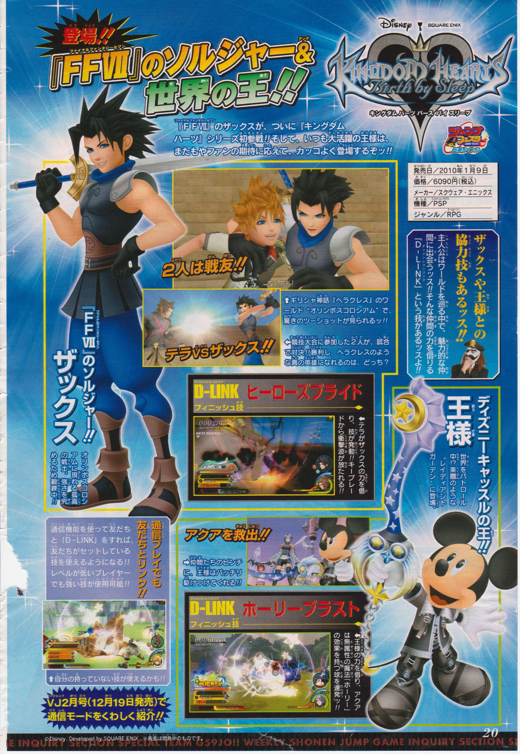 Mais um personagem famoso da série Final Fantasy dará as caras em Kingdom Hearts: Birth By Sleep. A última edição da Shounen Weekly Jump revela pela primeira vez Zack, de Final Fantasy VII. Ex-integrante da Soldier, aparecia nos flashbacks do sétimo episódio, e foi protagonista de FFVII: Crisis Core (PSP) também. Vejam a scan: