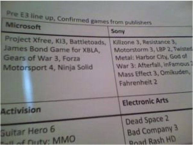 Uma lista com os supostos jogos para E3 espalhou-se pela Internet via Twitter. Ninguém sabe ao certo a origem da lista ou como esta veio parar na Internet. Na imagem acima podem observar que por parte da Microsoft os jogos confirmados são: Gears of War 3, Forza Motorsport 4, Ninja Solid e um jogo do James Bond para o Xbox Live Arcade. Na parte da Sony estão Killzone 3, Resistance 3, LBP 2, Mass Effect 3 (virou multiplataforma?!), God of War 3: Afterfall (DLC?!), Infamous 2 e mais outros. Além disto, no canto inferior direito da imagem está Call of Duty: MMO e Guitar Hero 6. No Canto inferior esquerdo encontram-se Dead Space 2 e Bad Company 3.