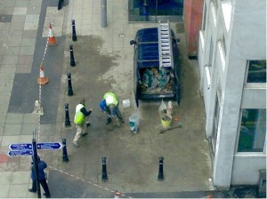 Esses homens estão instalando pilares de ferro numa calçada no Porto, para impedir o estacionamento de carros em frente a um banco.