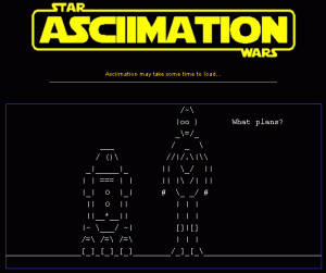 Ascii star wars parte 1/2 [youtube=http://br.youtube.com/watch?v=kdhrE5RMDfQ] Ascii star wars parte 2/2 [youtube=http://br.youtube.com/watch?v=vxW2EePW8qA] How to get a Star Wars ASCII Film from your computer [youtube=http://br.youtube.com/watch?v=YOnnJYVNFeU&feature=related] Veja tambem: ZORK – Game Text Adventure